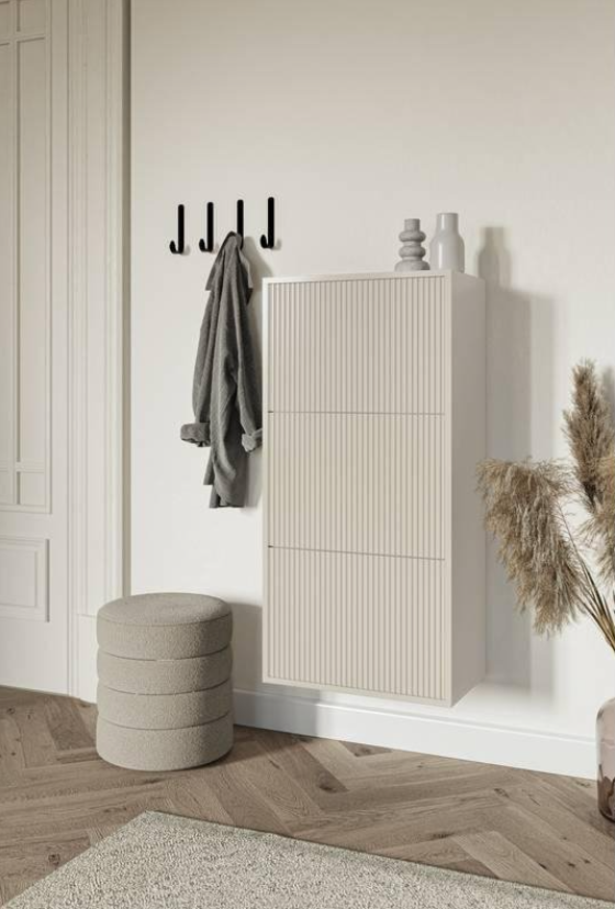 Erger je je aan de rondslingerende schoenen in huis? Houd je gang netjes en georganiseerd door schoenen efficiënt én stijlvol op te bergen. Kies voor een smal schoenenkastje of een schoenenrek dat aansluit bij de beschikbare ruimte. Zwevende schoenenkasten zijn een slimme oplossing als je de ruimte in je gang optimaal wilt benutten; ze bieden niet alleen handige opbergruimte, maar geven de hal ook een luchtige uitstraling, waardoor de ruimte groter lijkt. Heb je al gehoord van de Vesper schoenenkasten van Naduvi? Deze elegante serie heeft een moderne uitstraling met een verticale ribbelstructuur aan de voorkant, wat zorgt voor extra textuur en een stijlvolle touch aan de ruimte toevoegt.